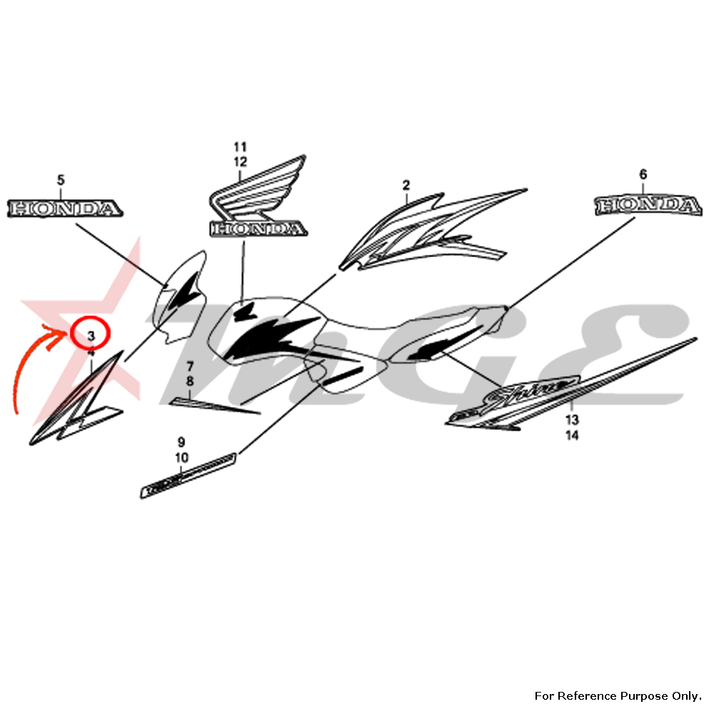 Stripe, R. Fr. Visor For Honda CBF125 - Reference Part Number -  #61306-KTE-A00ZA, #61306-KTE-A00ZB, #61306-KTE-A00ZC, #61306-KTE-A00ZD, #61306-KTE-A00ZE